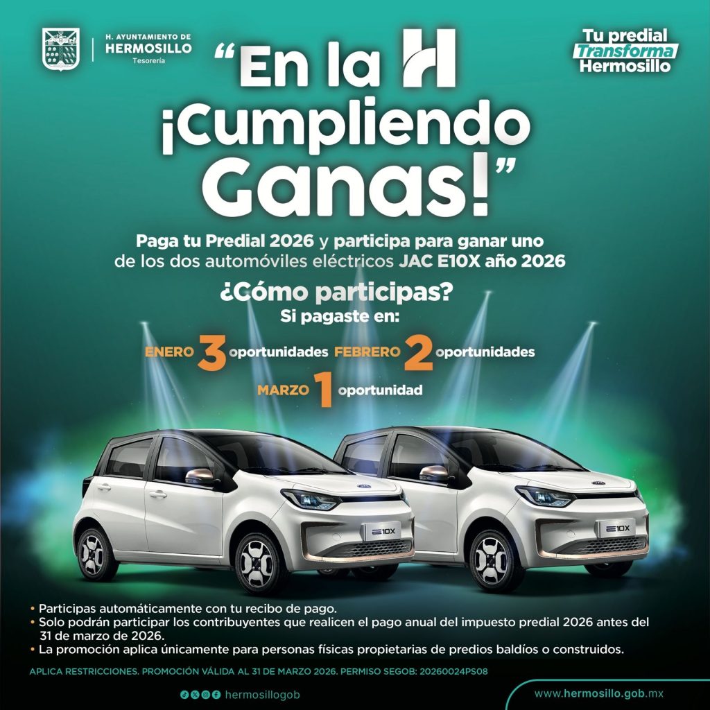 El próximo martes 28 de abril será el gran sorteo de dos carros eléctricos ¡En la H, Cumpliendo Ganas!, y a partir del 15 de abril estarán disponibles los folios con los que participarán todos los contribuyentes que pagaron su predial de enero a marzo de 2026.