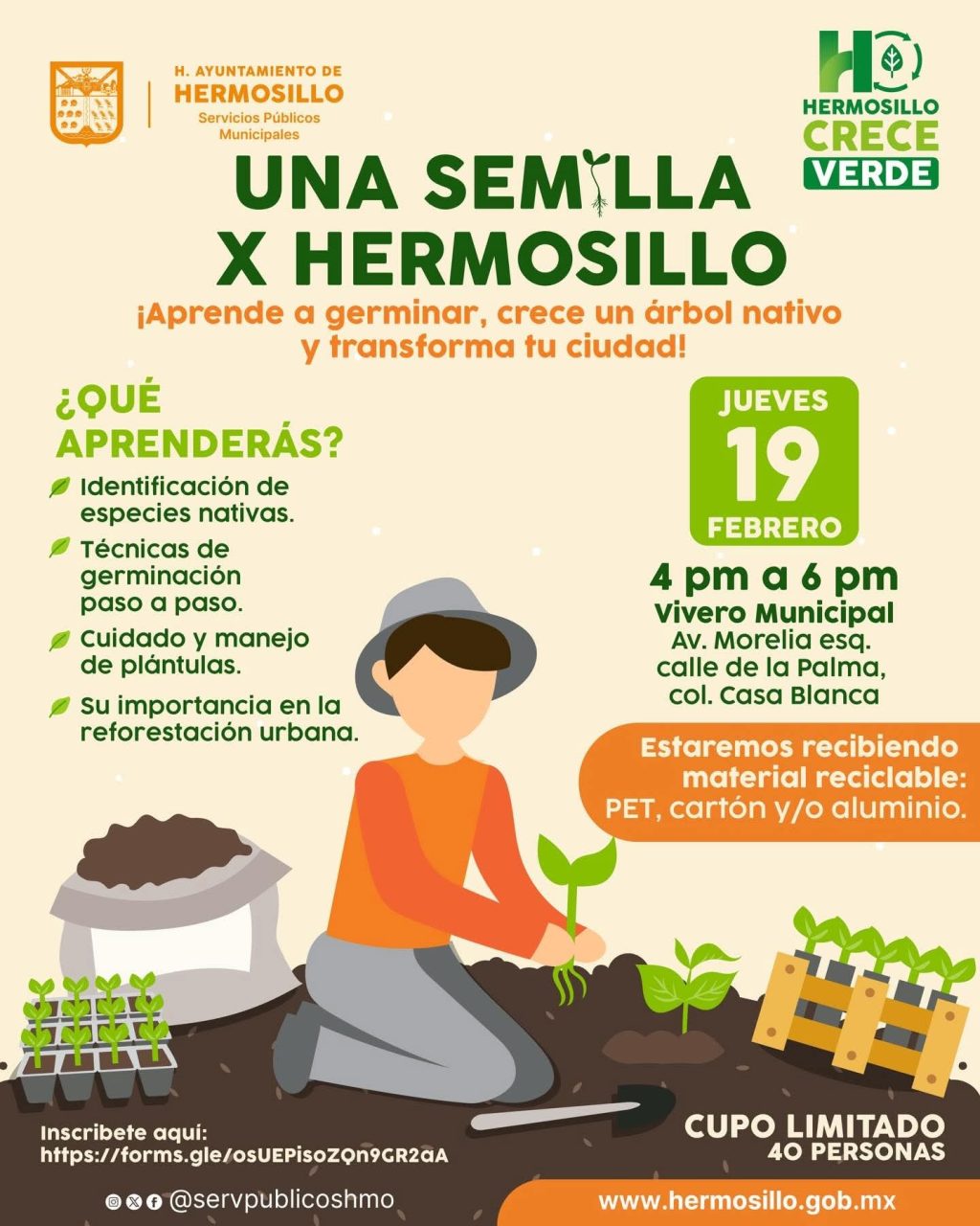 Una invitación a las y los hermosillenses a asistir al taller gratuito “Una Semilla X Hermosillo” donde aprenderán a germinar y crecer un árbol nativo para contribuir a transformar la ciudad realizó Amparo Fontanot Ochoa, directora de Parques y Jardines de Servicios Públicos Municipales.