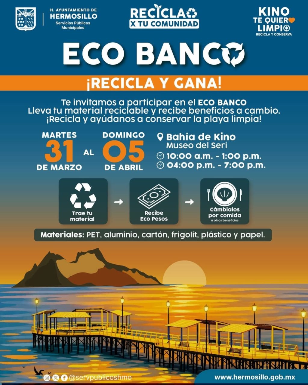 Esta Semana Santa las y los vacacionistas pueden contribuir al medio ambiente con el Eco Banco, en el que pueden canjear material reciclable por comidas en negocios participantes en Bahía de Kino, informó Sergio Pavlovich Escalante, director de Servicios Públicos Municipales.